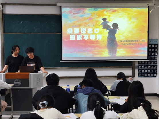 “同學們,猜一猜明天是什么節日???”“母親節!”5月11日,新聞傳播學類專業2023(7)、(8)班在K202教室開展以“愛要說出口,感恩不等待”為主題的團建活動。活動開始前,活動負責人、新聞傳播學類專業2023(7)、(8)班的班長楊雨霏、朱研溪提前為每位同學準備好信紙和信封。朱研溪說:“我們希望通過寫信這種傳統而深情的溝通方式,讓同學們勇敢表達自己的心聲,將對母親的愛訴說于筆尖?!睂W生們觀看一段關于母愛的感人短片后,...